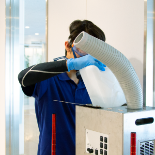 ウイルス・細菌に対して、幅広い除菌と洗浄効果のある加速化過酸化水素(ハイプロックスアクセル)による拭き上げ作業を行います。