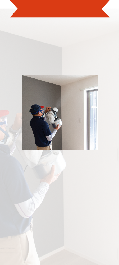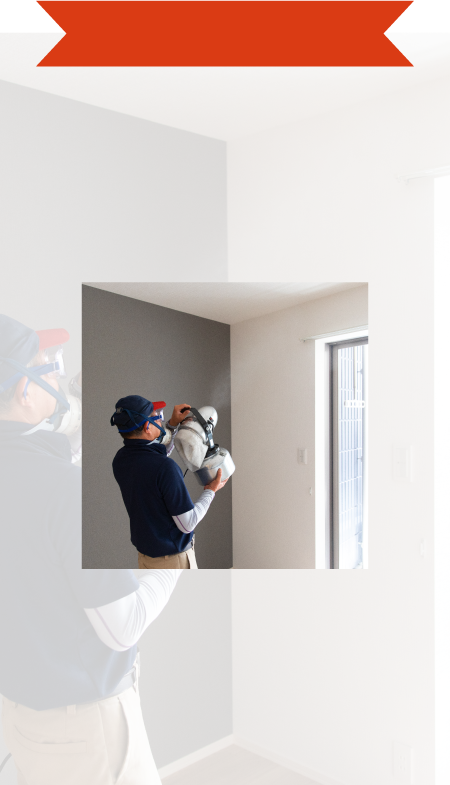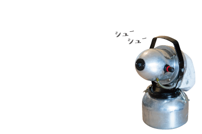建物内は超音波霧化器を使い、厚労省推奨の微酸性次亜塩素酸水を空間の隅々までミスト散布、建物外部は噴霧いたします。