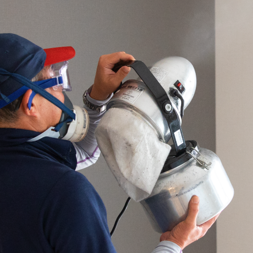 カーペットパイルに入り込んだゴミ・ダニ・汚れなどHEPAフィルターを搭載した除塵機にて吸い上げてから、スプレー式の専用機械にマイクロファイバーパットを使用して、パットに汚れを移し替えます。
