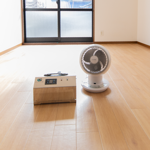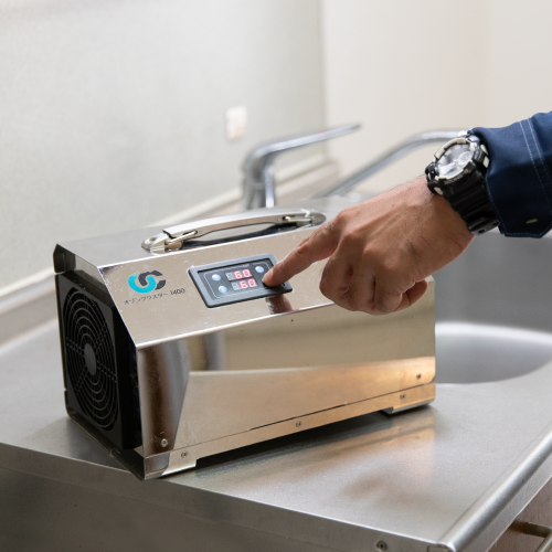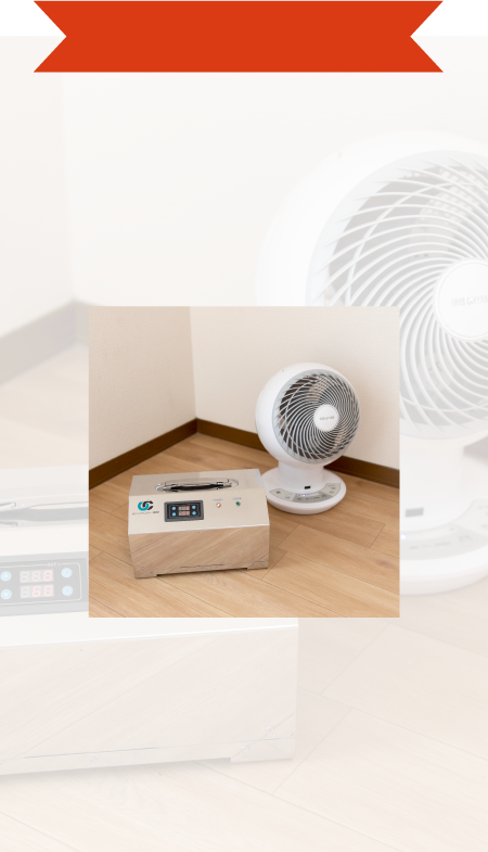 行います。建物内はオゾン生成機にて空間の隅々まで、抗菌作業の場合は、