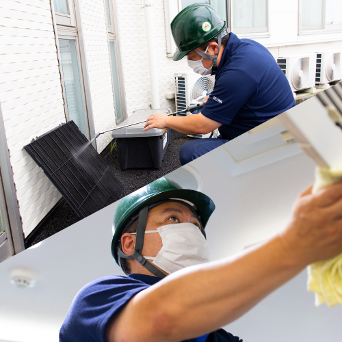 居室清掃、カーペットクリーニング、床のワックスがけ、お風呂場の清掃、排水管のつまり抜き、エアコンの分解洗浄、害虫駆除、高圧洗浄、ガラス清掃。セイワの仕事ぶりについて。