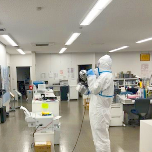 行います。建物内はオゾン生成機にて空間の隅々まで、抗菌作業の場合は、